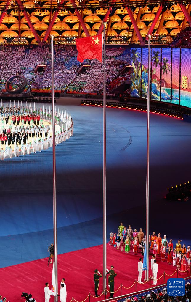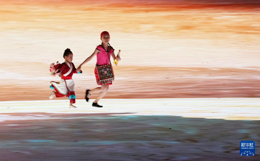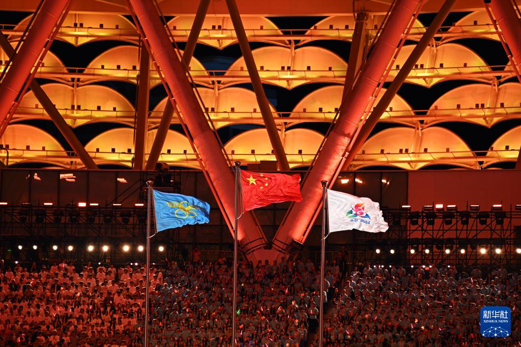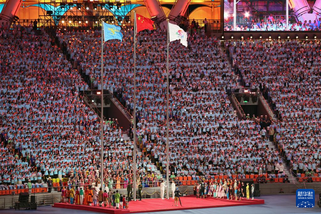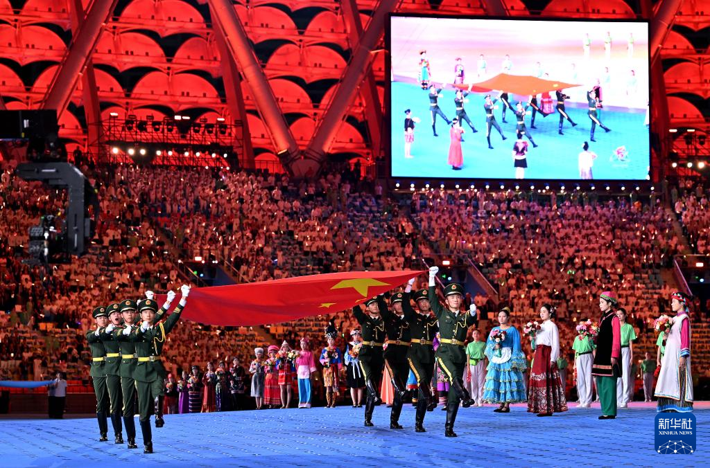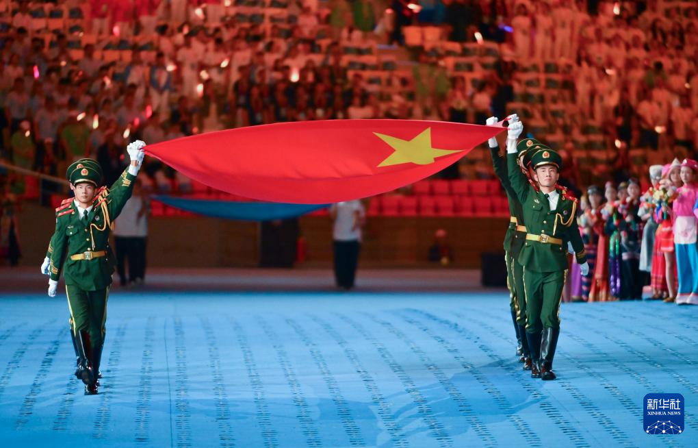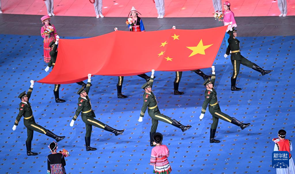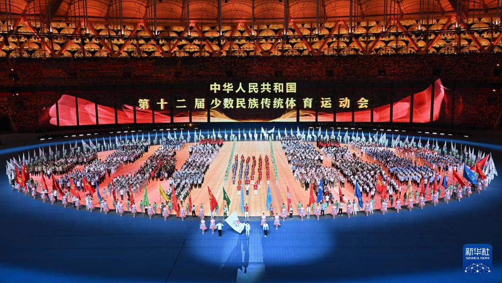 11月22日,開幕式現(xiàn)場(chǎng)升起中華人民共和國(guó)國(guó)旗、中華人民共和國(guó)少數(shù)民族傳統(tǒng)體育運(yùn)動(dòng)會(huì)會(huì)旗和中華人民共和國(guó)第十二屆少數(shù)民族傳統(tǒng)體育運(yùn)動(dòng)會(huì)會(huì)旗。