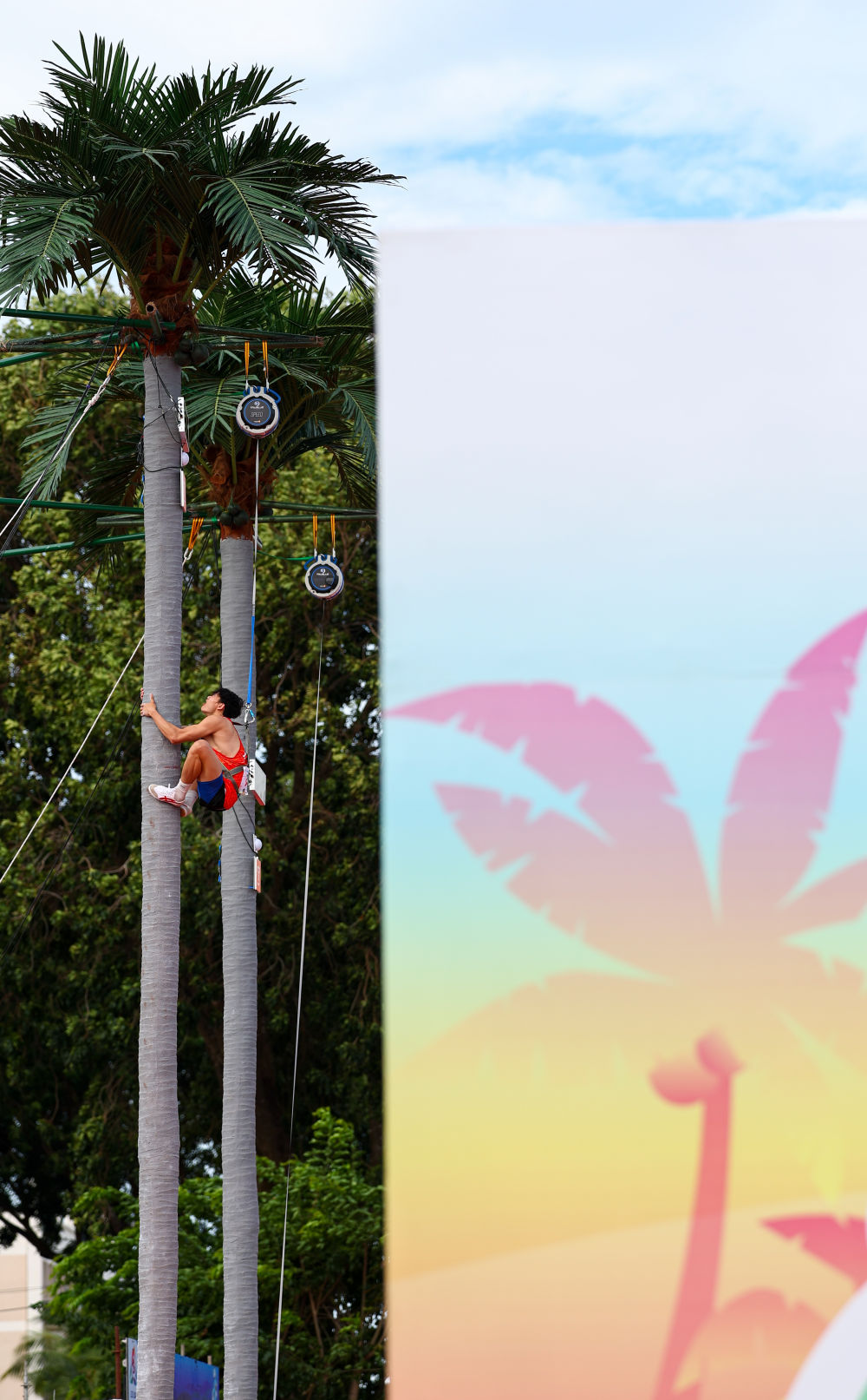 相比在運動會上歷史悠久的龍舟,當(dāng)日上演的攀椰競速則是在本屆賽事首次撞入人們的眼簾。在椰子樹上手腳并用攀爬,迅速抵達頂端,不問可知,這一競技性與趣味性兼具的運動脫胎于海南當(dāng)?shù)厝罕妭鹘y(tǒng)的徒手爬樹摘椰子場景。