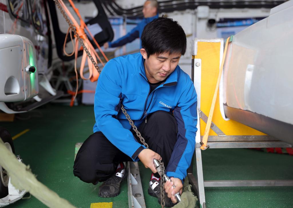 執(zhí)行中國(guó)第41次南極考察任務(wù)的“雪龍”號(hào)和“雪龍2”號(hào)于北京時(shí)間2024年11月19日開(kāi)始穿越“咆哮”西風(fēng)帶。這是“雪龍2”號(hào)直升機(jī)機(jī)組成員畢凌峰在擰緊直升機(jī)固定件。新華社記者黃韜銘攝