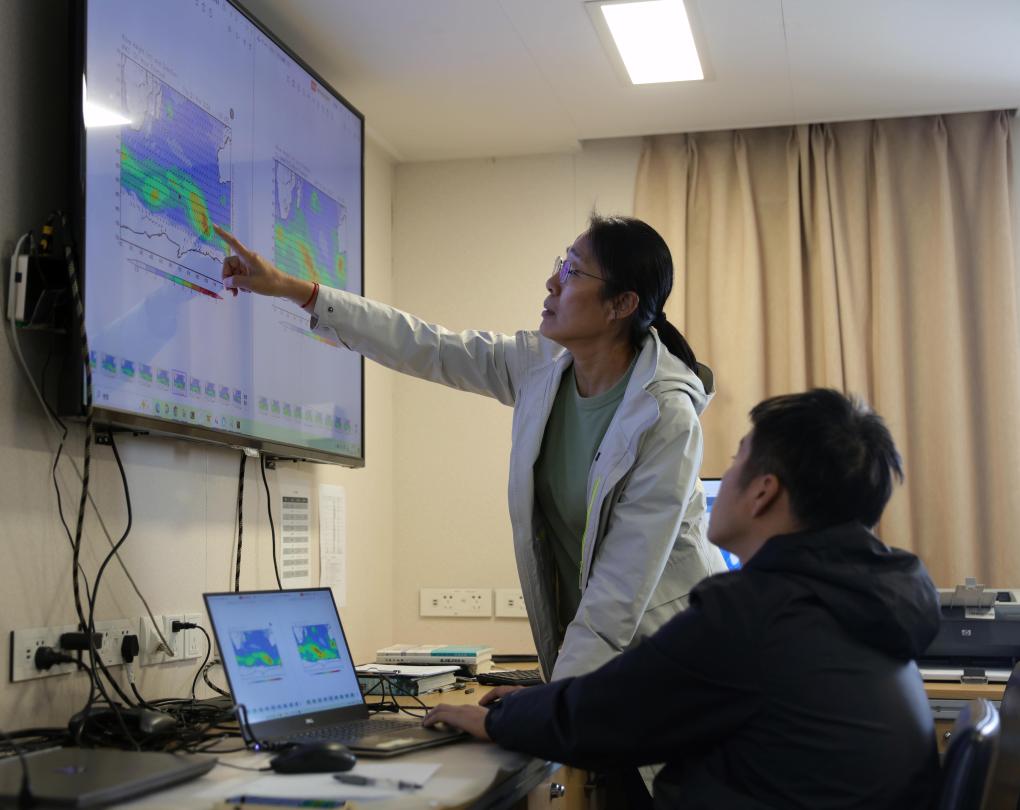 執(zhí)行中國(guó)第41次南極考察任務(wù)的“雪龍”號(hào)和“雪龍2”號(hào)于北京時(shí)間2024年11月19日開(kāi)始穿越“咆哮”西風(fēng)帶。這是“雪龍2”號(hào)隨船氣象保障員劉素芳(左)在研判天氣情況,規(guī)劃航行路線。新華社記者黃韜銘攝