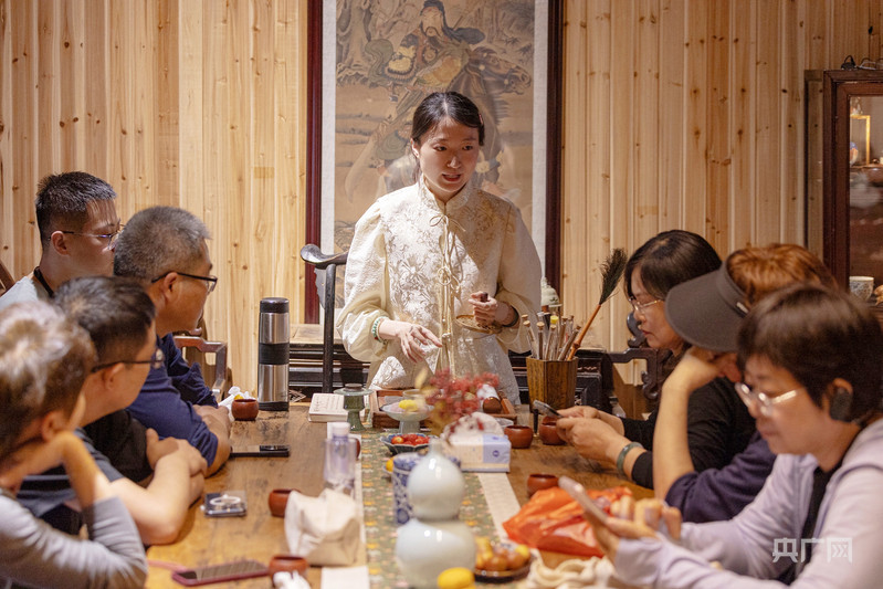 在倒扒獅街,“90后”安慶姑娘秦?zé)o顏是一家文化主題會館的主理人。在她的會館里,檀木、玉石等制作而成的新中式文玩飾品、傳統(tǒng)工藝面料制作而成的“新中式”服裝、古色古香的“新中式”茶館,定期舉行的雅集活動……無一不體現(xiàn)著獨(dú)特的東方美學(xué)。2020年,在上海從事珠寶設(shè)計工作的她返回家鄉(xiāng)經(jīng)營起這家文化空間。“既逐新,也尋根?!彼M?,客人來到這里,放慢腳步,在交流與體驗(yàn)中感受傳統(tǒng)文化的魅力,豐富精神體驗(yàn)。