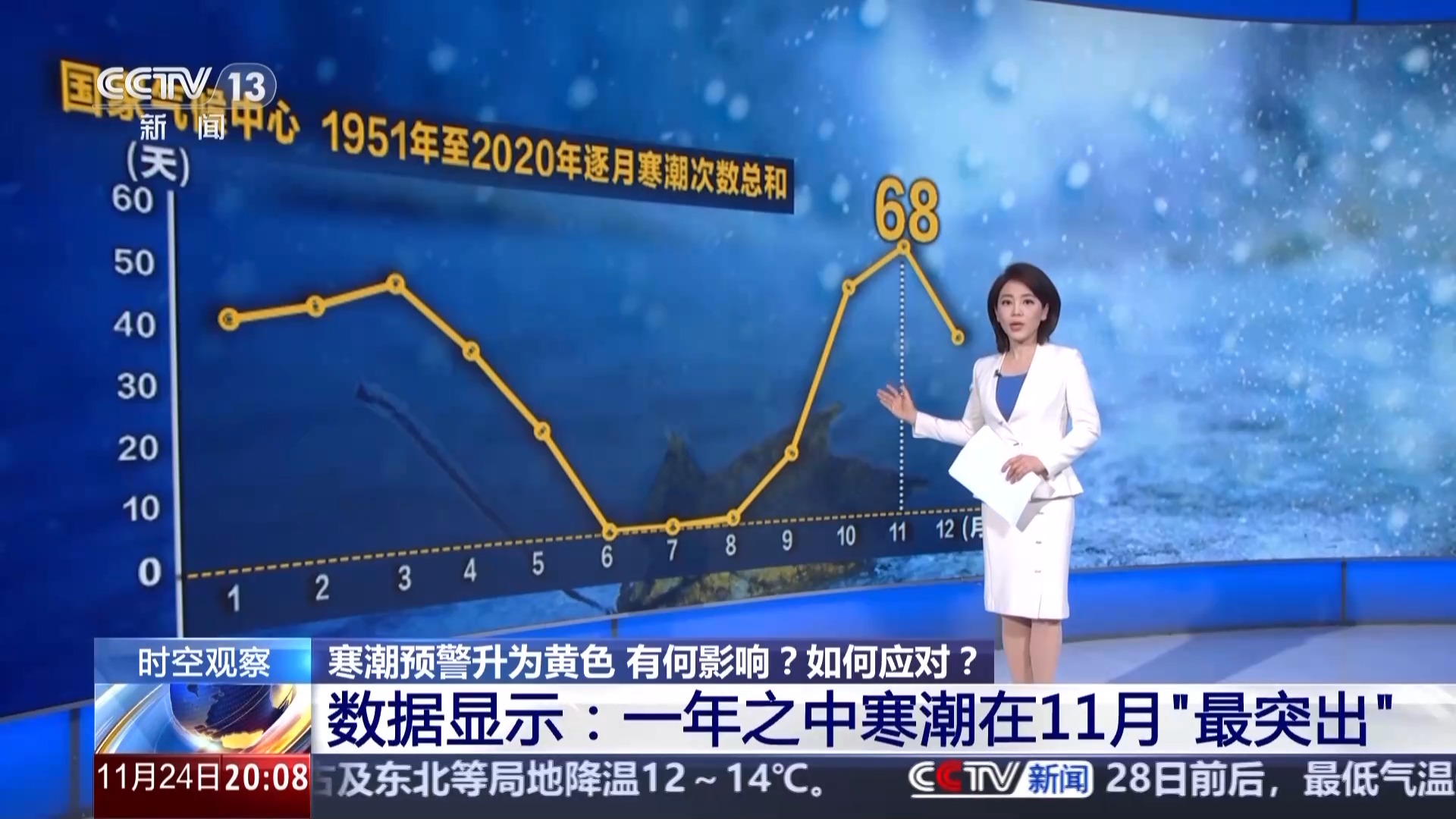 從國家氣候中心“1951年至2020年逐月寒潮次數總和”的數據中就可以看到:一年之中,寒潮在11月表現最突出,1951到2020年在我國一共出現了68次,相反在6到7月,則一次都沒有露面。