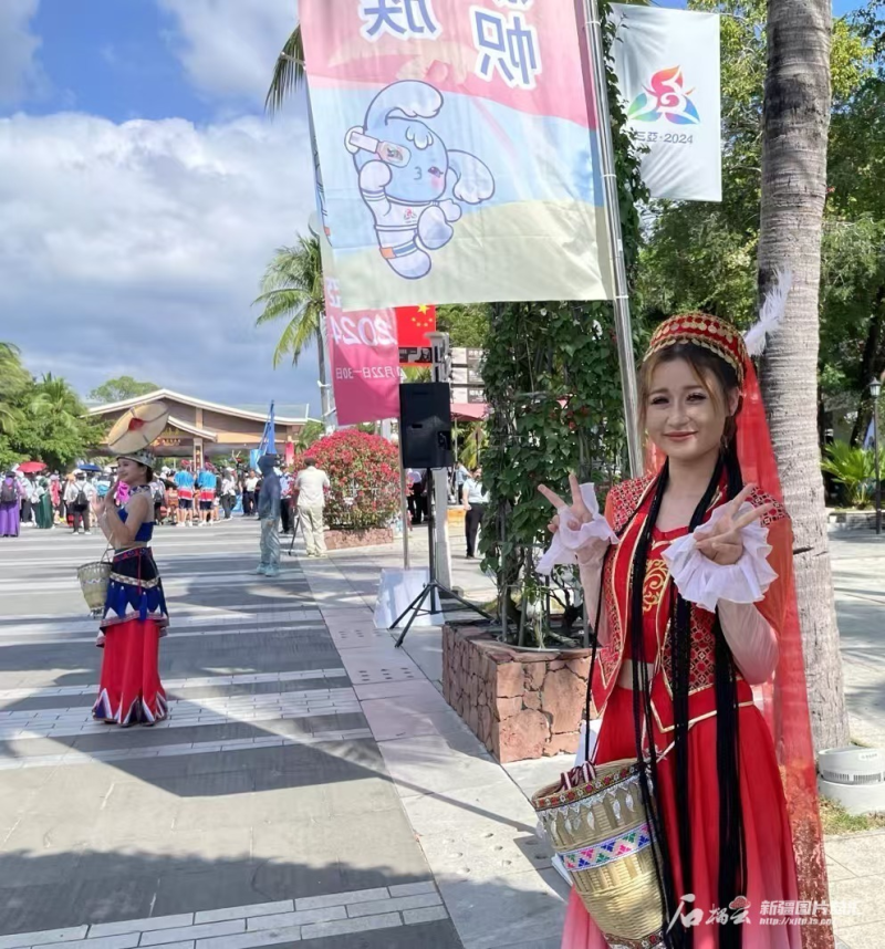 歡迎儀式的人群中,一頭麻花辮的艾麗非熱·艾爾肯非常引人注意,很多運動員前去與她合影,“我們排練一個月了,我要用最好的狀態(tài)為運動員加油,今天看見了很多家鄉(xiāng)的運動員,特別激動,等我表演完就去找他們合影?!卑惙菬峤榻B,她家在新疆阿克蘇,在三亞理工職業(yè)學(xué)院上大二,這幾天每天都在關(guān)注運動會的各類信息。