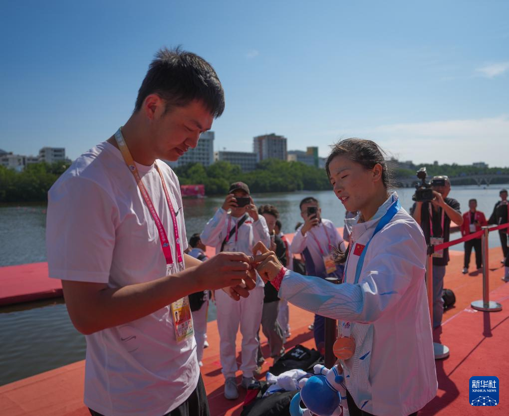 11月28日,何國潤(右)的男朋友向她求婚。當(dāng)日,在海南省三亞市舉行的第十二屆全國少數(shù)民族傳統(tǒng)體育運(yùn)動(dòng)會(huì)獨(dú)竹漂女子組200米直道賽頒獎(jiǎng)儀式后,海南隊(duì)選手何國潤的男朋友在頒獎(jiǎng)儀式現(xiàn)場(chǎng)向她求婚,上演溫情一幕。新華社發(fā)(杜笑微 攝)