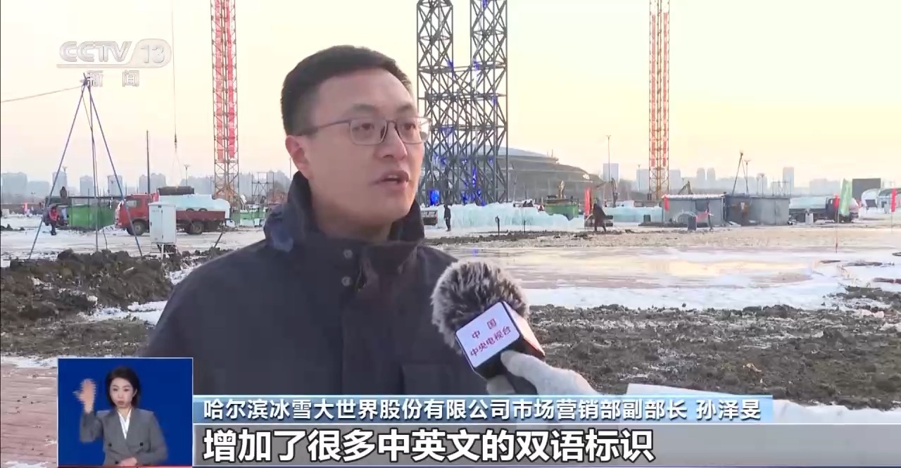 哈爾濱冰雪大世界股份有限公司市場營銷部副部長 孫澤旻:增加了很多中英文的雙語標(biāo)識,同時增加了英文的導(dǎo)游導(dǎo)覽服務(wù)。為了方便外國游客可以在園區(qū)內(nèi)購票,增加了可以識別護照、識別國際支付的支付系統(tǒng)和購票系統(tǒng)。
