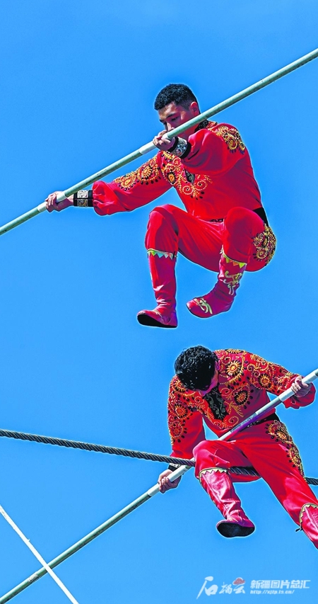11月24日,新疆代表團(tuán)達(dá)瓦孜隊(duì)隊(duì)員在展示空中“飛人”技藝。