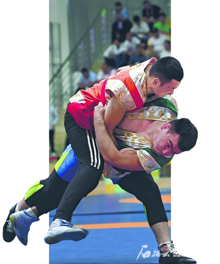 11月27日,新疆代表團(tuán)運(yùn)動(dòng)員亞沙爾·提力瓦力地(右)在民族式摔跤且里西項(xiàng)目74公斤級(jí)比賽中獲得一等獎(jiǎng)。