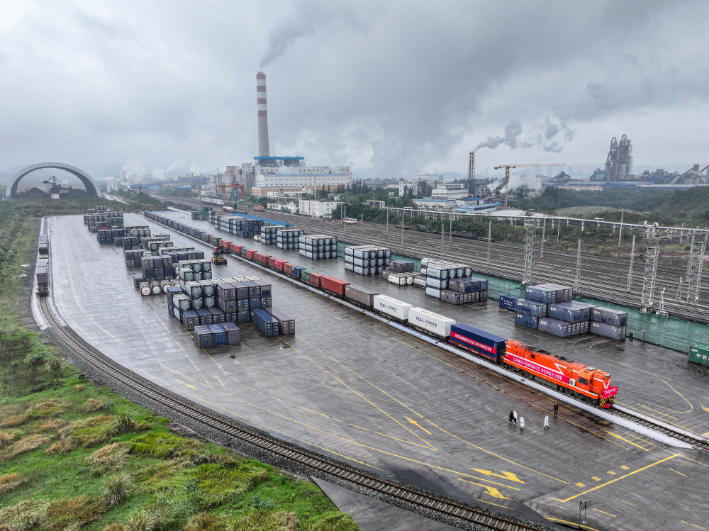 11月19日,重慶市動力鋰電池全國鐵路試運首發(fā)班列在重慶長壽渝巴專用鐵路等待發(fā)車(無人機(jī)照片)。新華社記者 唐奕 攝