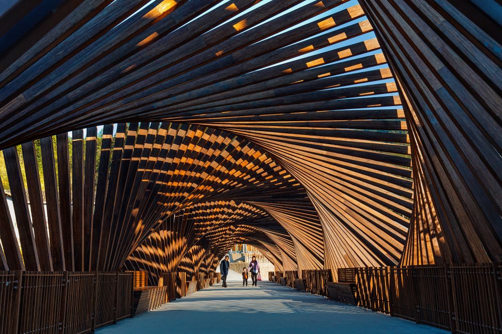 圖為溪頭村國(guó)際竹建筑村落16個(gè)建筑單體之一“時(shí)光隧道橋”。新華社發(fā)