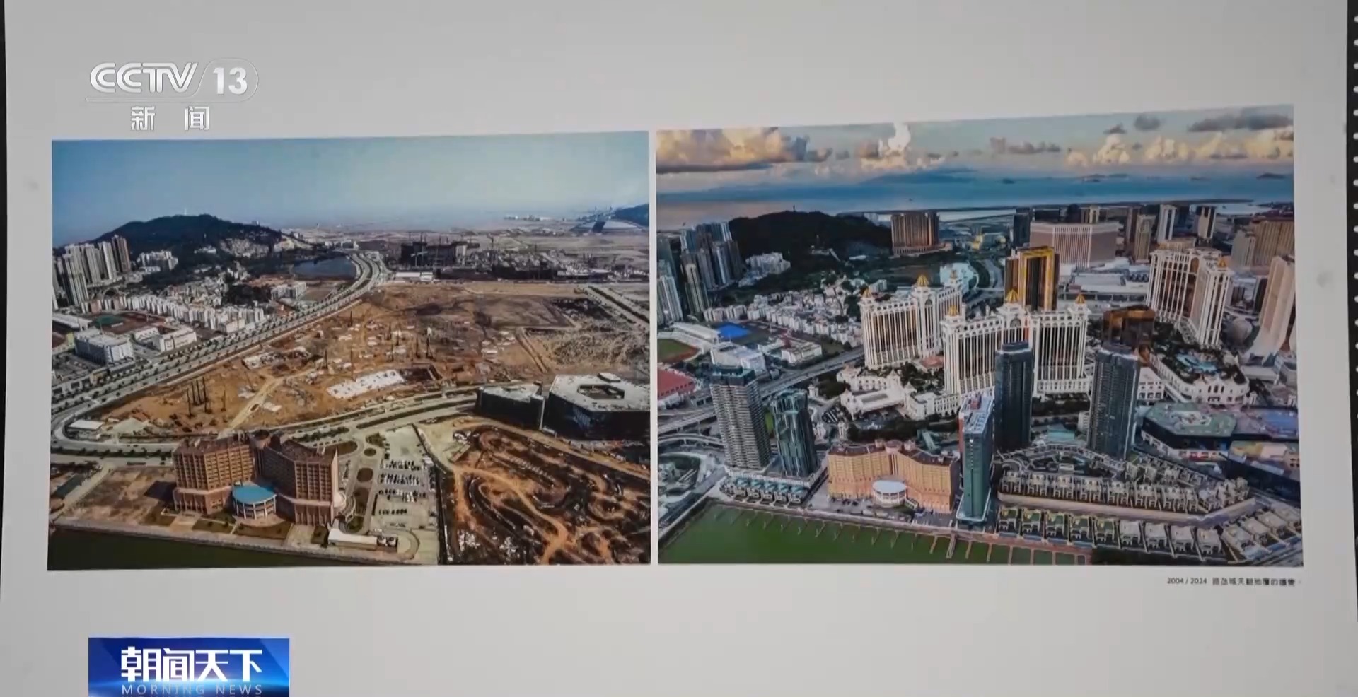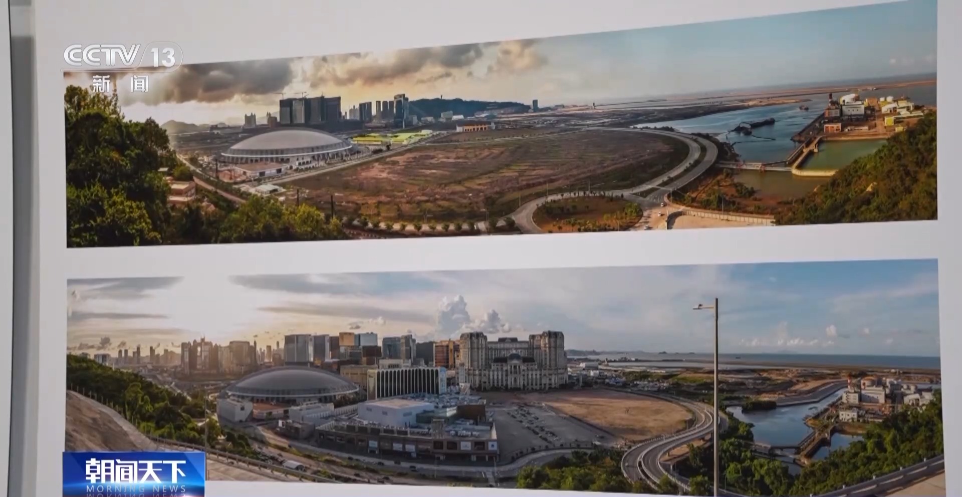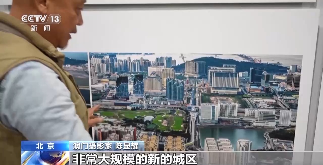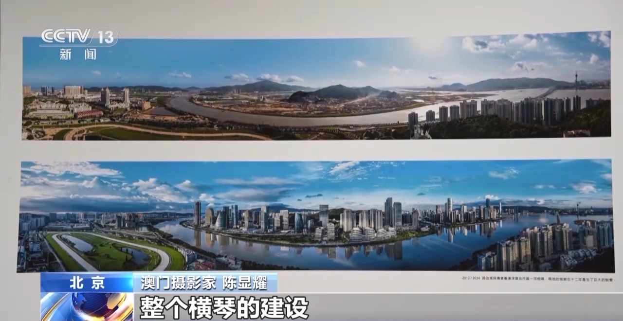 澳門(mén)攝影家 陳顯耀:回歸之后,隨著我們澳門(mén)的發(fā)展,也是帶動(dòng)周邊區(qū)域一起發(fā)展繁榮。我們畫(huà)面看到的是橫琴,上面的照片是2012年的時(shí)候,橫琴都是山體,在準(zhǔn)備開(kāi)發(fā)了。下面是成立的橫琴粵澳深度合作區(qū),整個(gè)橫琴的建設(shè)也為我們澳門(mén)的發(fā)展建設(shè)提供了一個(gè)很重要的支撐、保障。