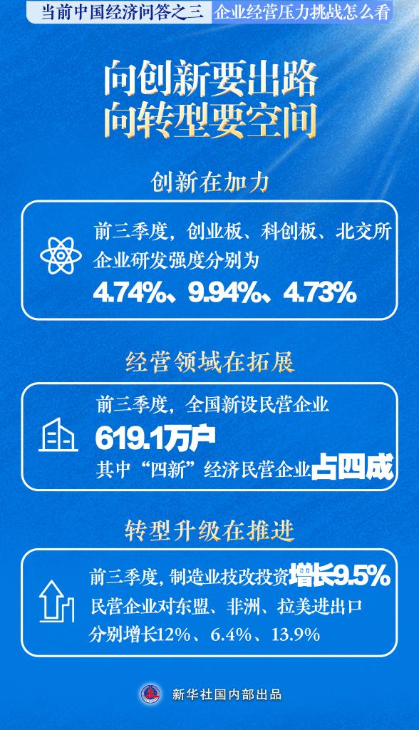 前三季度,全國新設(shè)民營企業(yè)619.1萬戶,其中“四新”經(jīng)濟民營企業(yè)占四成,經(jīng)營領(lǐng)域在拓展。