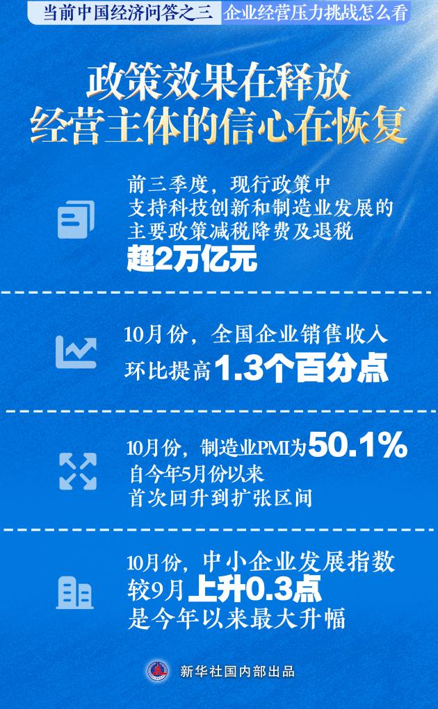 10月份,全國企業(yè)銷售收入同比增長,環(huán)比提高1.3個百分點;制造業(yè)PMI為50.1%,自今年5月份以來首次回升到擴張區(qū)間;非制造業(yè)商務(wù)活動指數(shù)連續(xù)數(shù)月穩(wěn)定在50%左右;中小企業(yè)發(fā)展指數(shù)較9月上升0.3點,是今年以來最大升幅。