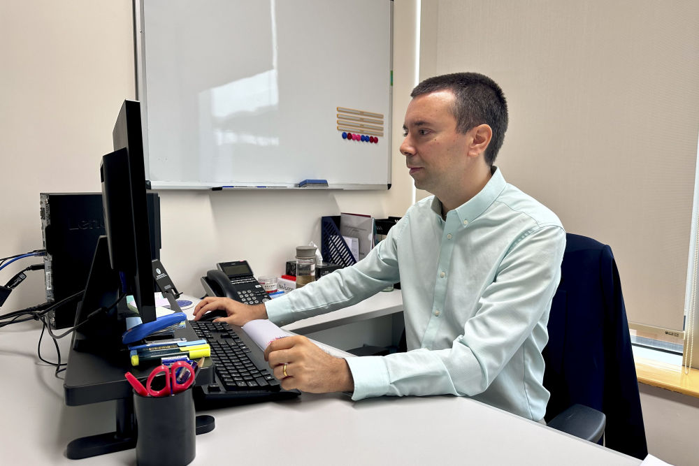 2024年11月21日,澳門(mén)城市大學(xué)葡語(yǔ)國(guó)家研究院的助理教授、來(lái)自葡萄牙的若昂·西蒙斯(中文名朱奧)在辦工室工作。新華社記者 王露 攝
