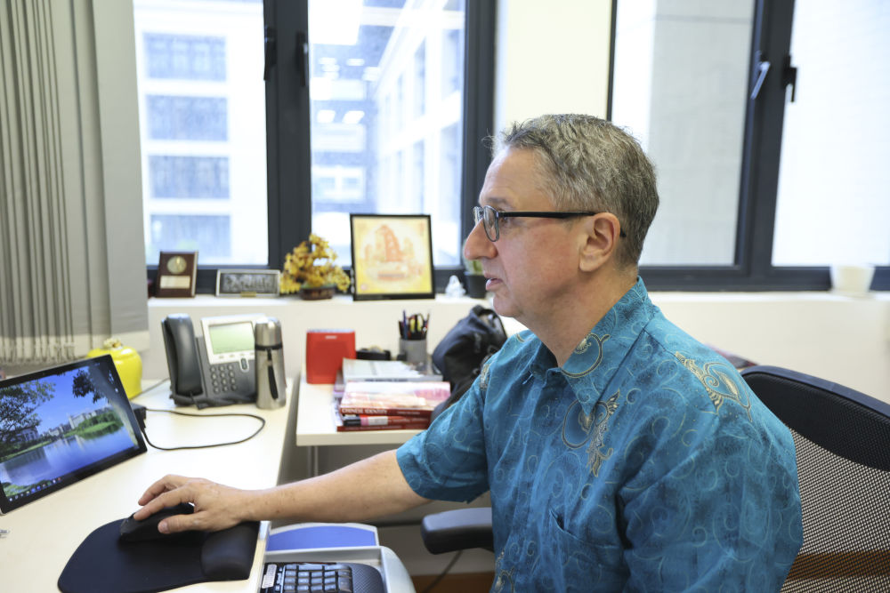 2024年11月14日,澳門(mén)大學(xué)社會(huì)科學(xué)學(xué)院副教授、來(lái)自美國(guó)的托德·萊爾·桑德?tīng)枺ㄖ形拿甏蟮拢┰谵k公室工作。新華社記者 梁家駿 攝