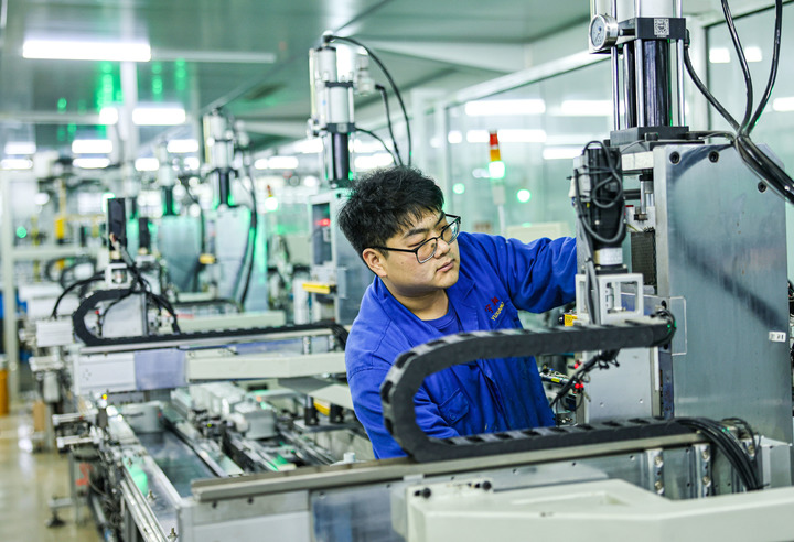 2024年12月12日,在山東省榮成市一家燃氣計量儀表制造企業(yè)的智能化生產(chǎn)車間內(nèi),維修工人在進行設備調(diào)試。新華社發(fā)(李信君攝)
