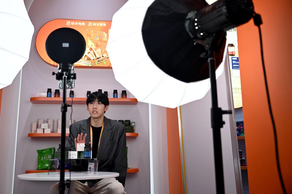 2024年11月5日,快手跨境主播在第七屆進博會服務貿(mào)易展區(qū)直播。新華社發(fā)(陳浩明攝)