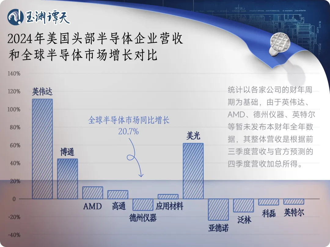 譚主統(tǒng)計了英偉達之外美國營收排名前十的芯片企業(yè),發(fā)現(xiàn)其中80%的企業(yè)本財年的營收增速遠低于全球芯片市場的增速,甚至,有五家企業(yè)今年預(yù)計都是負(fù)增長。