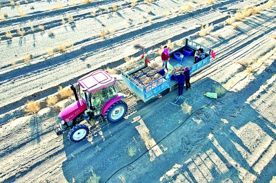 甘肅巴丹吉林沙漠邊緣,工人將采挖好的肉蓯蓉裝車。