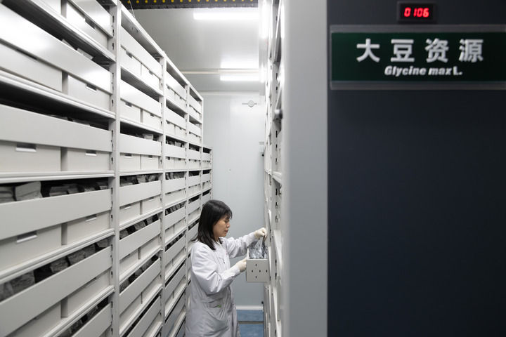 2024年4月2日,工作人員在國家寒帶作物及大豆種質(zhì)資源中期庫(哈爾濱)查看大豆種質(zhì)情況。新華社記者 張濤 攝