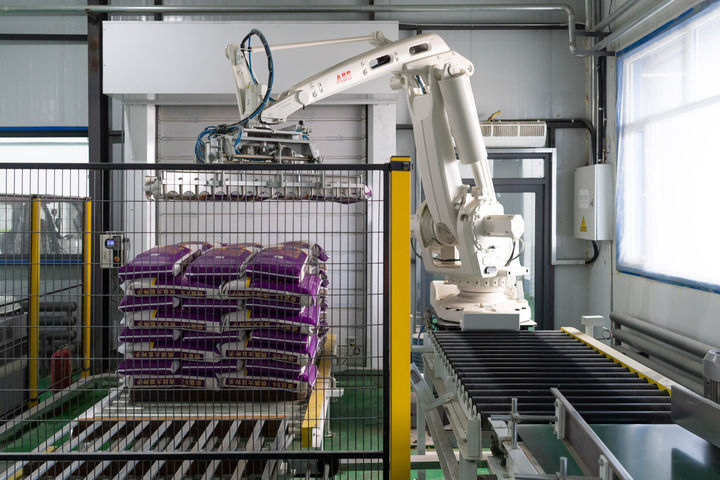 2024年3月29日,黑龍江省黑河市五大連池市一家農(nóng)業(yè)科技企業(yè)的機械臂在車間內(nèi)碼放包裝好的大豆種子。新華社記者 謝劍飛 攝