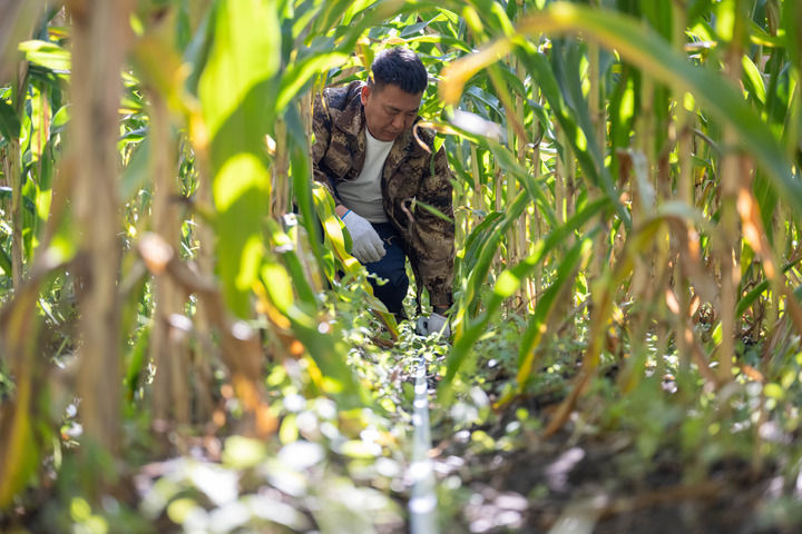 2024年9月24日,黑龍江省寶清縣農(nóng)業(yè)技術(shù)推廣中心的農(nóng)藝師在寶清縣青原鎮(zhèn)一片玉米地中測產(chǎn)。新華社記者 謝劍飛 攝