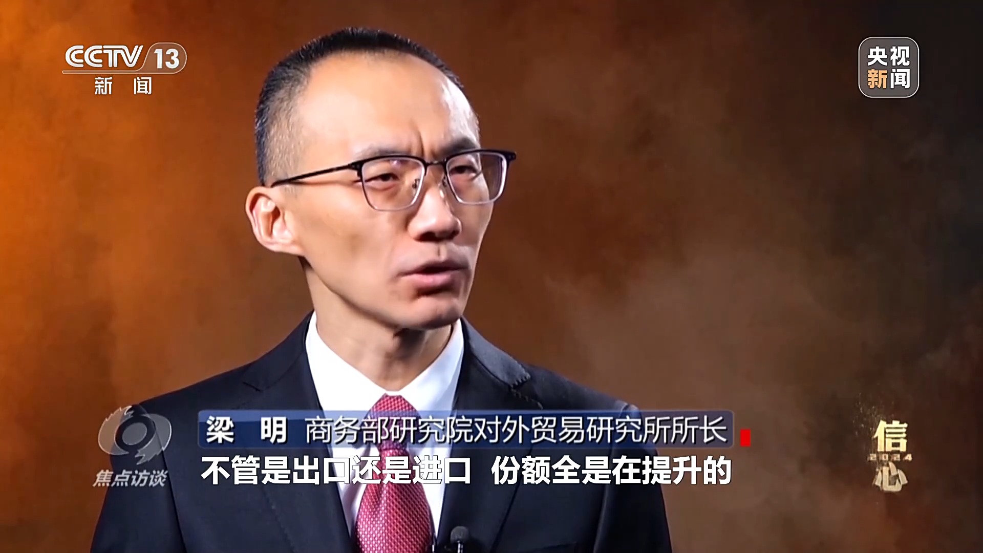商務(wù)部研究院對(duì)外貿(mào)易研究所所長(zhǎng) 梁明:“今年前三月,中國(guó)出口同比增速4.7%。前11月,增速達(dá)到了6.7%,在逐漸回穩(wěn)向好。不管是出口還是進(jìn)口,份額全是在提升的,顯示了中國(guó)貿(mào)易在全球中的地位進(jìn)一步凸顯,貿(mào)易的質(zhì)量,還有貿(mào)易的結(jié)構(gòu)在逐步優(yōu)化?!?/p>
