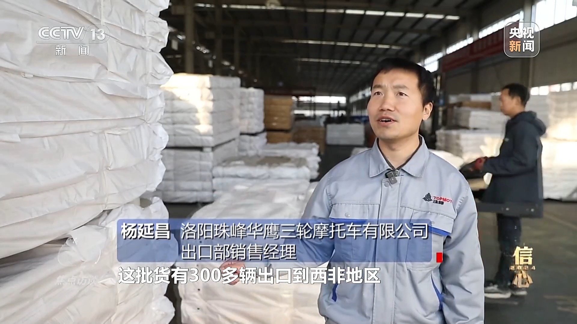 洛陽(yáng)珠峰華鷹三輪摩托車(chē)有限公司出口部銷(xiāo)售經(jīng)理 楊延昌:“這批貨有300多輛出口到西非地區(qū),目前訂單量已經(jīng)達(dá)到了3萬(wàn)臺(tái),排到了25年3月份?!?/p>