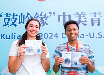 參加2024“鼓嶺緣”中美青年交流周活動(dòng)的兩名學(xué)生代表展示在鼓嶺“打卡”“蓋章”。新華社記者 魏培全攝
