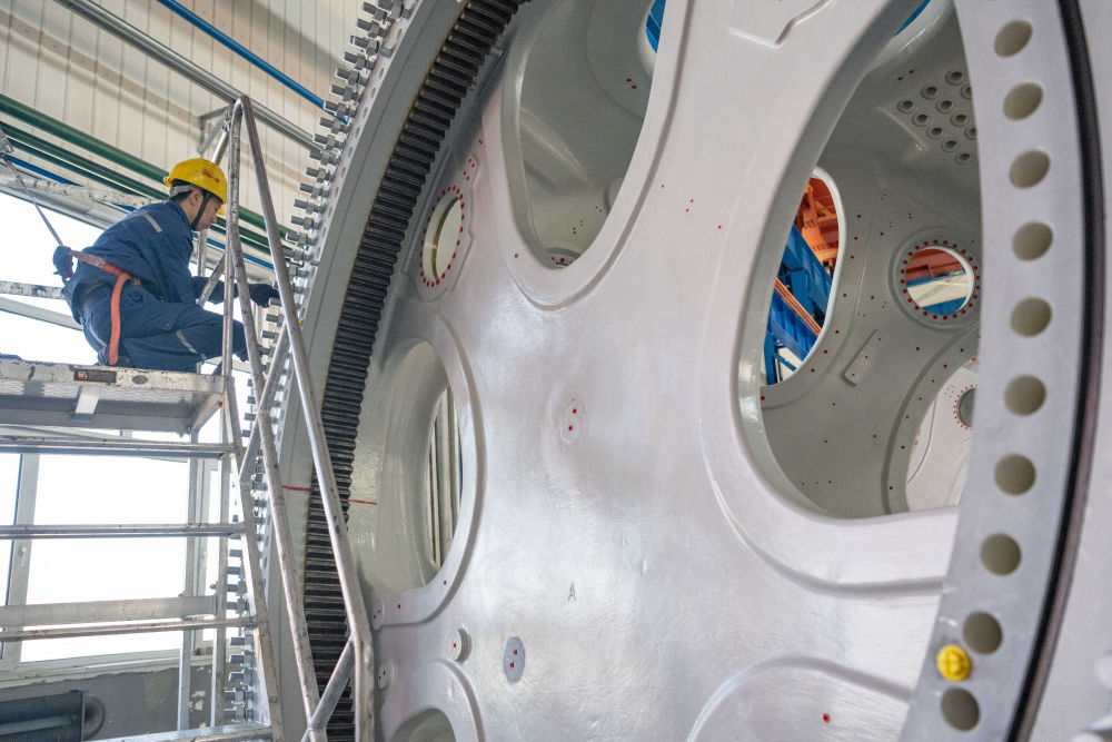 工人在位于黑龍江省齊齊哈爾市的中國一重集團有限公司風電設(shè)備裝配車間加工風電輪轂(4月28日攝)。新華社記者 謝劍飛 攝