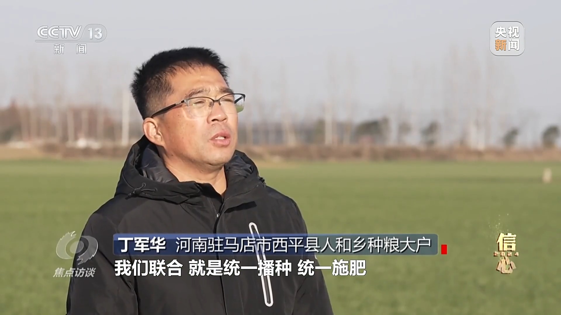 河南駐馬店市西平縣仁和鄉(xiāng)種糧大戶 丁軍華:“我們聯(lián)合就是統(tǒng)一播種、統(tǒng)一施肥、統(tǒng)一管理、統(tǒng)一打藥、統(tǒng)一購(gòu)銷和統(tǒng)一收割,做到了‘六統(tǒng)一’,共同抱團(tuán)去跟廠家談判、爭(zhēng)取最低的價(jià)格。這一次小麥播種,我們從黑龍江引進(jìn)大型氣吸型播種機(jī),地少了它不來(lái),用這種播種機(jī),一畝地比普通播種機(jī)增產(chǎn)15%以上。”