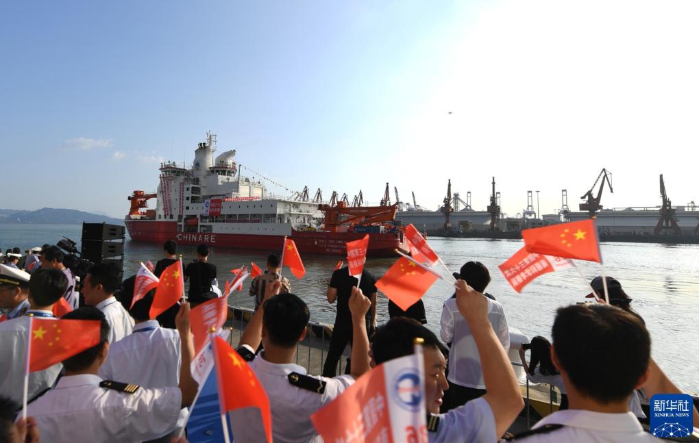 2019年10月15日,在深圳蛇口太子灣郵輪母港碼頭,工作人員送別“雪龍2”號。新華社記者 毛思倩 攝