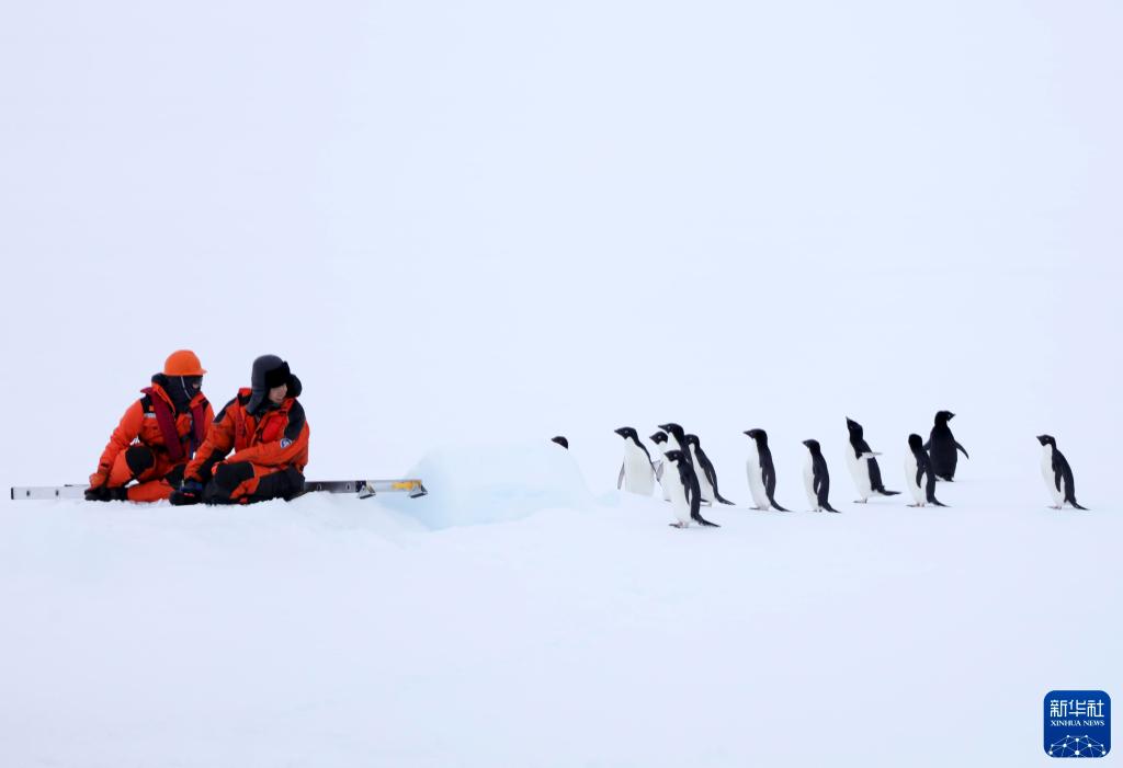 2024年12月8日,第41次南極考察隊員吸引了企鵝前來“圍觀”。 新華社記者 黃韜銘 攝