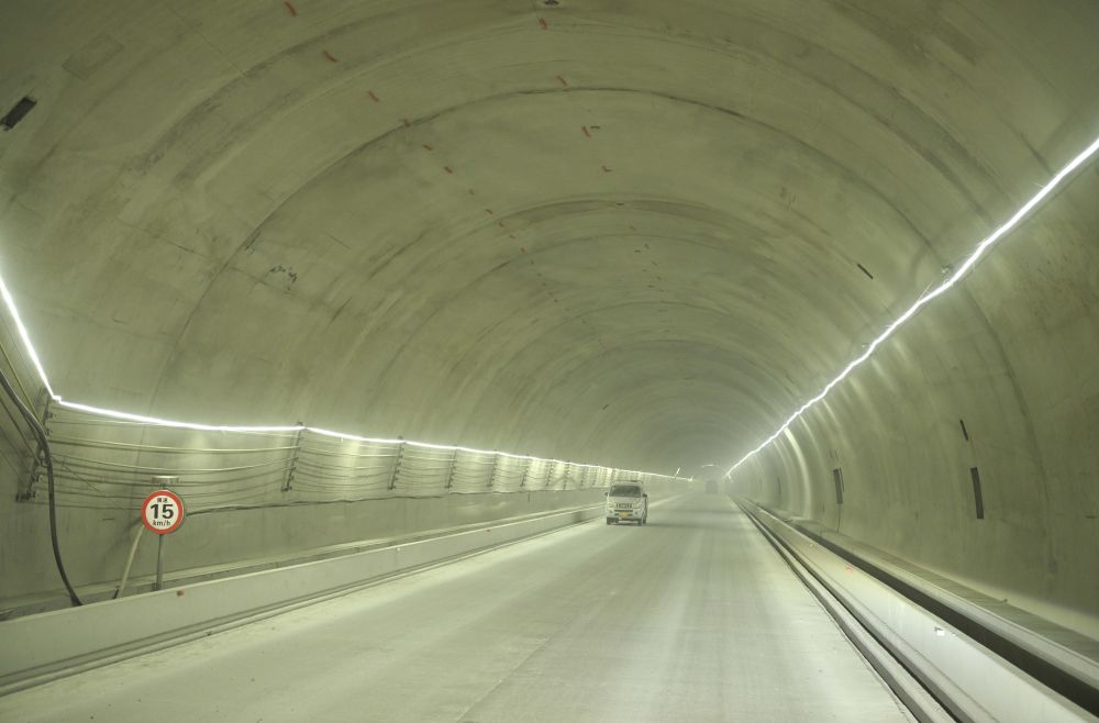 這是一次前所未有的駕駛體驗,隧道足可容納兩車并行,路面平坦。隧道內(nèi)部,LED燈帶照亮前路,去除幾分幽深神秘。每隔百米左右,就有通向中導(dǎo)洞的通道,遇到施工堵路,也可以很快調(diào)整路線。