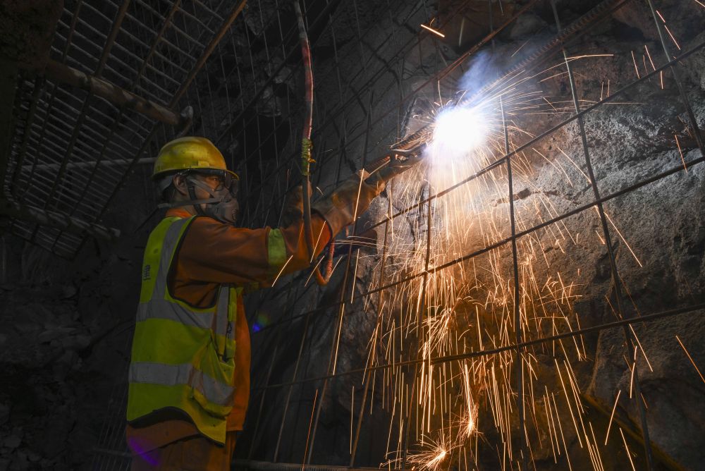 一段剛剛打通的隧道接口處,新固定的巖層還露出猙獰的粗糲;大型機械在遠處操作,每一次動作都激起陣陣轟鳴……