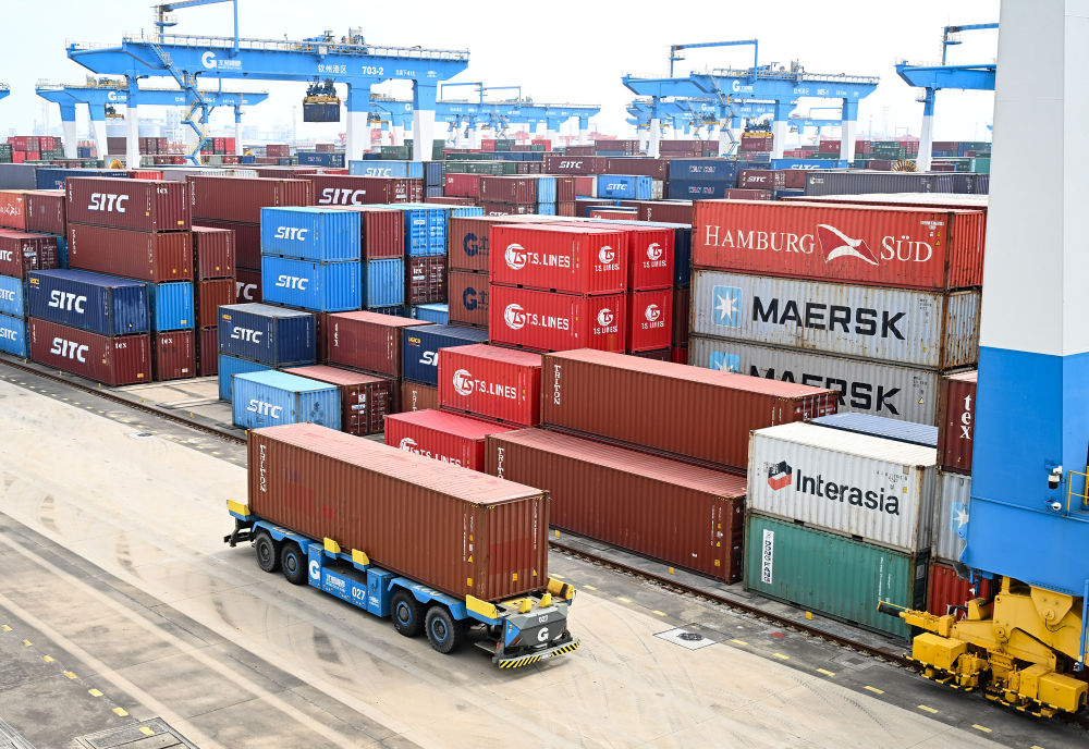 2024年10月20日,在廣西北部灣港欽州港區(qū)碼頭,一輛自動化無人轉(zhuǎn)運(yùn)車在運(yùn)送集裝箱。各式各樣運(yùn)往東盟各國的貨物在這個海鐵聯(lián)運(yùn)自動化集裝箱碼頭實(shí)現(xiàn)“下船即上車、下車即上船”。新華社記者李賀攝