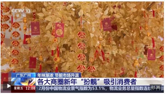在廣州各大商圈,歡喜過大年的喜慶裝扮陸續(xù)煥新,有的擺上紅紅火火的“金錢樹”,有的在商場(chǎng)內(nèi)設(shè)立各種展覽,增加消費(fèi)者購(gòu)物樂趣和文化體驗(yàn)?! ?