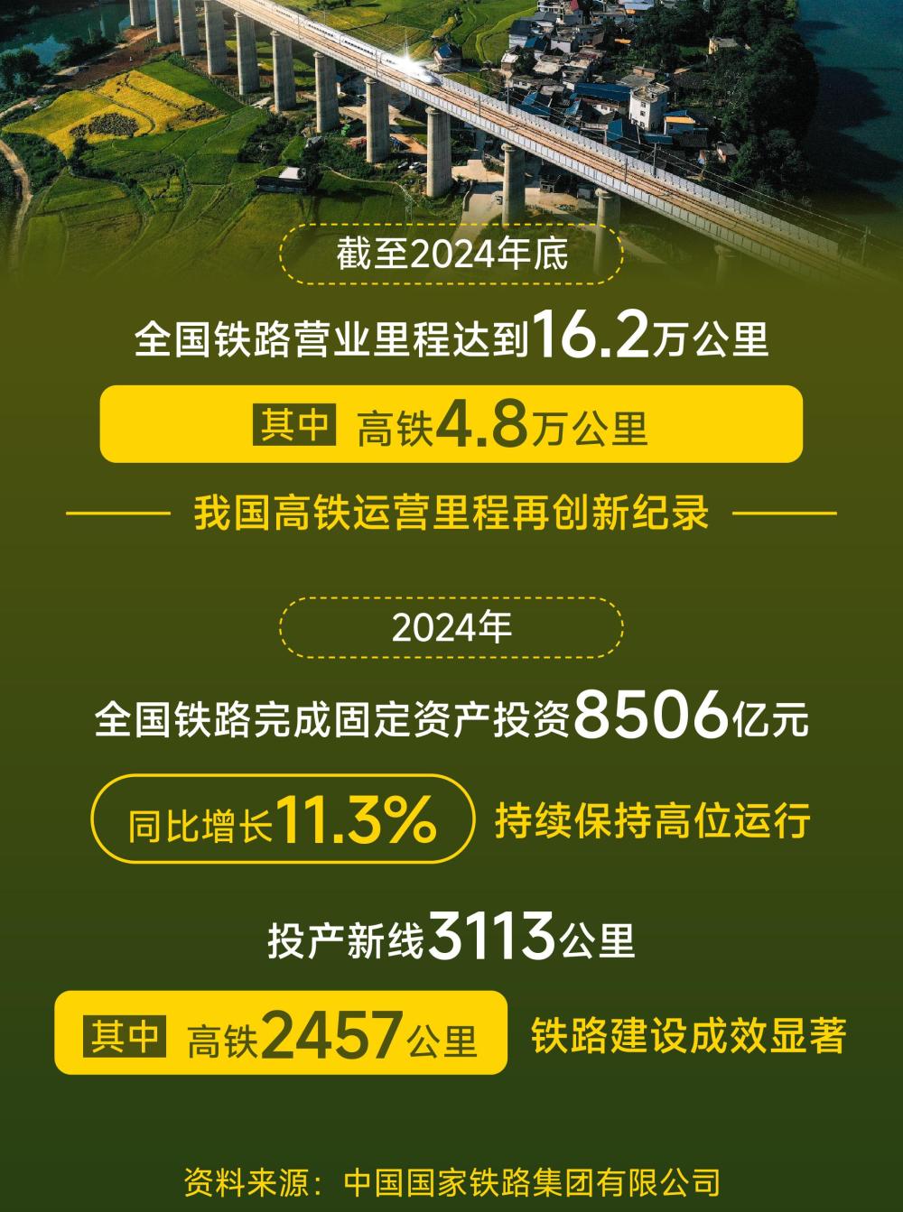 截至2024年底,全國鐵路營業(yè)里程達(dá)到16.2萬公里,其中高鐵4.8萬公里,我國高鐵運營里程再創(chuàng)新紀(jì)錄。