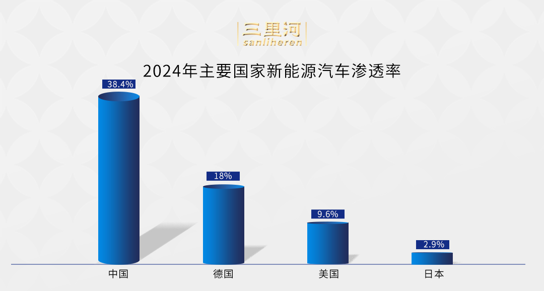 崔東樹提供的數(shù)據(jù)顯示,2024年,中國(guó)新能源汽車滲透率達(dá)到38.4%,德國(guó)達(dá)到18%,美國(guó)僅有9.6%,日本僅有約3%。世界汽車產(chǎn)業(yè)格局正發(fā)生變化。