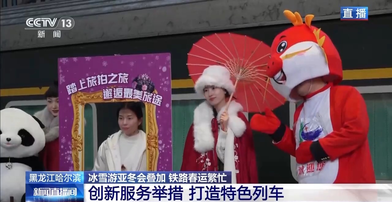 在春運期間,鐵路部門還打造了特色主題列車,比如現(xiàn)在已經(jīng)開通的“旅拍列車”。車上設(shè)置了哈爾濱街景、民俗文化、冰雪奇遇等主題場景,車上還有化妝間、更衣室,可以為旅客提供多種風格的旅拍服飾,旅客可以通過手機小程序進行預約。拍攝人員也是由愛好攝影的鐵路職工組成的旅拍團隊,大家都是利用業(yè)余時間為旅客免費提供服務(wù)。
