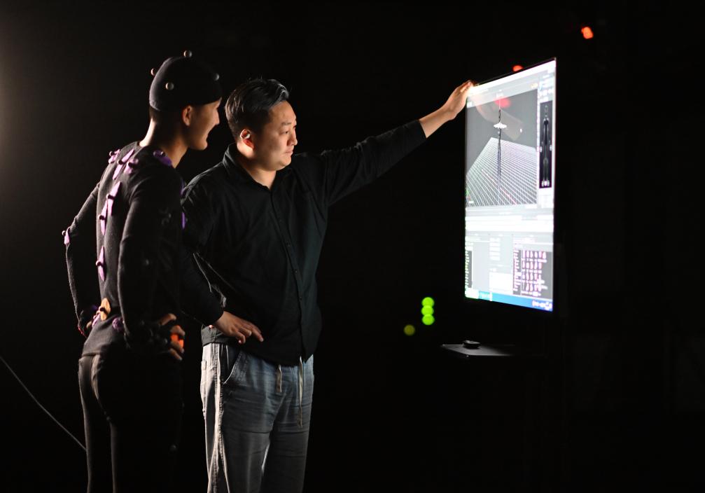 2024年4月23日,數(shù)字孿生應(yīng)用技術(shù)員崔盛輯(右)和同事在查看電腦生成的虛擬角色動作。新華社記者 趙子碩 攝