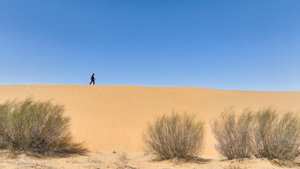 家住庫布其沙漠深處的烏日更,童年記憶里只有一種顏色?!凹依镌钆_(tái)、柜上有擦不完的黃沙,出門就是沙梁?!睘跞崭貞浾f,家鄉(xiāng)有個(gè)民謠唱道,“沙里人苦,沙里人累,滿天風(fēng)沙無植被……”