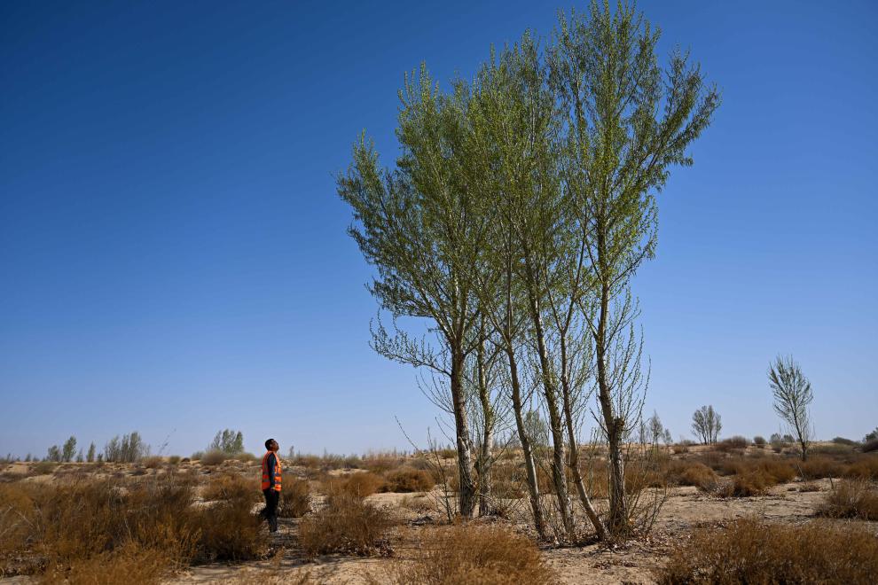 2024年4月11日,一名治沙人在達(dá)拉特旗境內(nèi)的庫布其沙漠里巡護(hù)樹木。新華社記者 李志鵬 攝