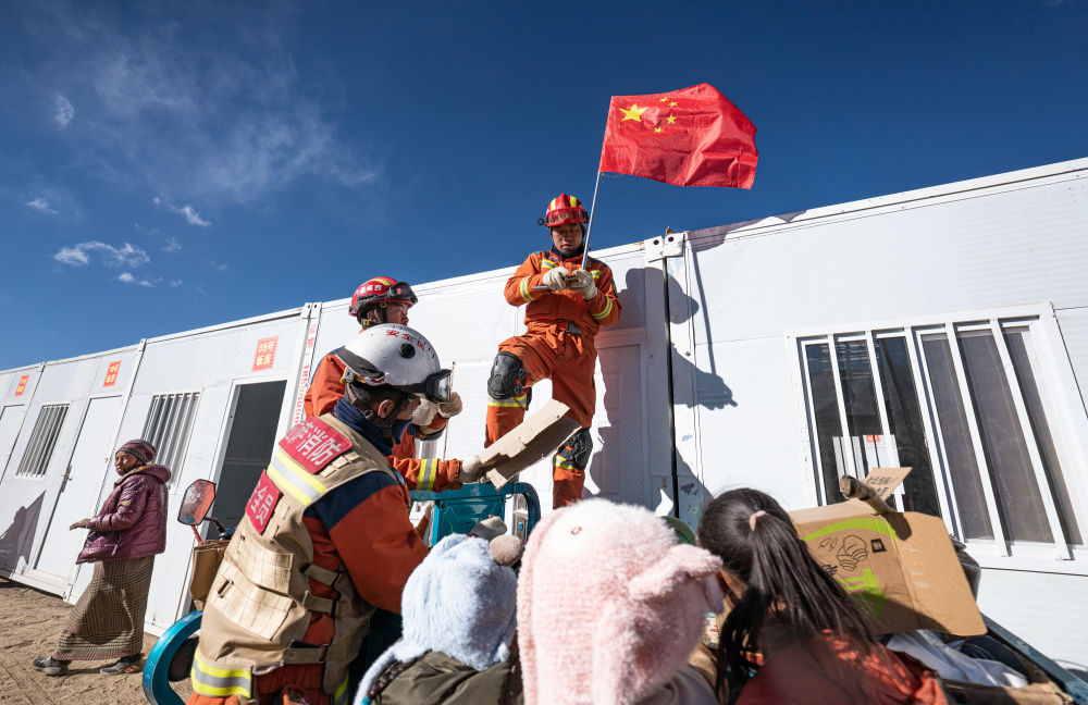 在定日縣措果鄉(xiāng)野江村,消防員在活動(dòng)板房上安置國旗(1月13日攝)。(新華社記者 丁增尼達(dá) 攝)
