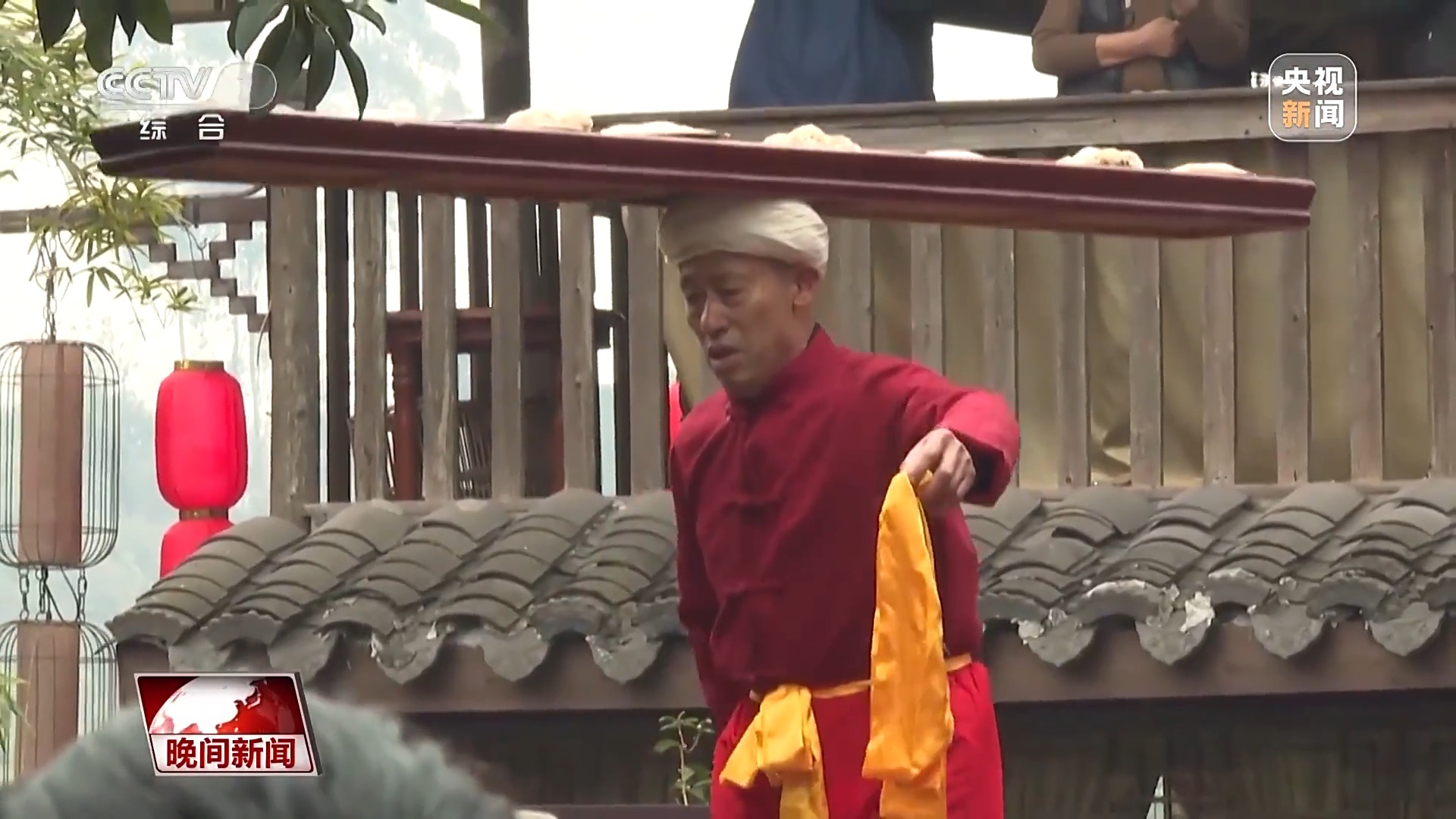 古鎮(zhèn)街道狹長,辦宴席時需要快速傳菜,于是便有了“打盆”這種獨(dú)特的上菜方式。在我們的左手邊,就有一位當(dāng)?shù)乩先苏诒硌荽蚺杞^技。