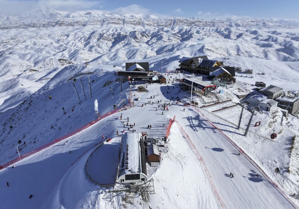 1月24日,游客在阿勒泰市將軍山國際滑雪度假區(qū)滑雪(無人機(jī)照片)。