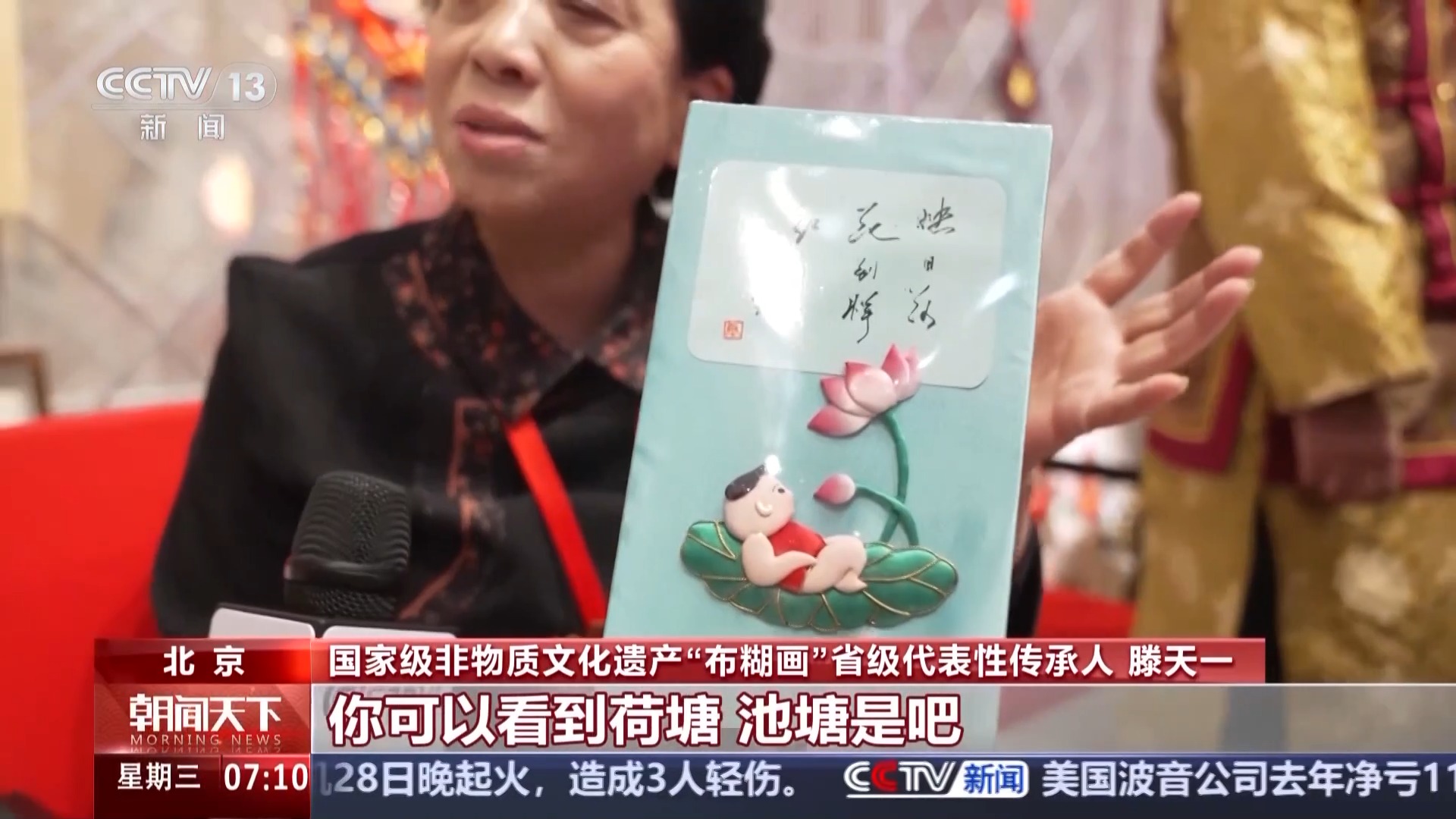 北京國(guó)家級(jí)非物質(zhì)文化遺產(chǎn)“布糊畫(huà)”省級(jí)代表性傳承人 滕天一:很多手工掛件做完了到不了一分鐘就買(mǎi)走了。從古到今幾千年了,我們中國(guó)的東西到哪兒你細(xì)看,它是有內(nèi)涵的東西。比如說(shuō)我拿了楊萬(wàn)里的一句詩(shī)“映日荷花別樣紅”你可以看到荷塘、池塘是吧,再想到我們的詩(shī)、詩(shī)人,它都是有意境的。