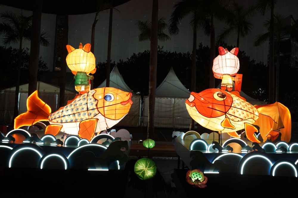 香港文化中心露天廣場(chǎng)上,一組由香港非物質(zhì)文化遺產(chǎn)辦事處策劃的扎作彩燈與四周景色相映成趣,錦鯉與金魚(yú)在水池上躍動(dòng),小醒獅站在魚(yú)背上嬉戲。