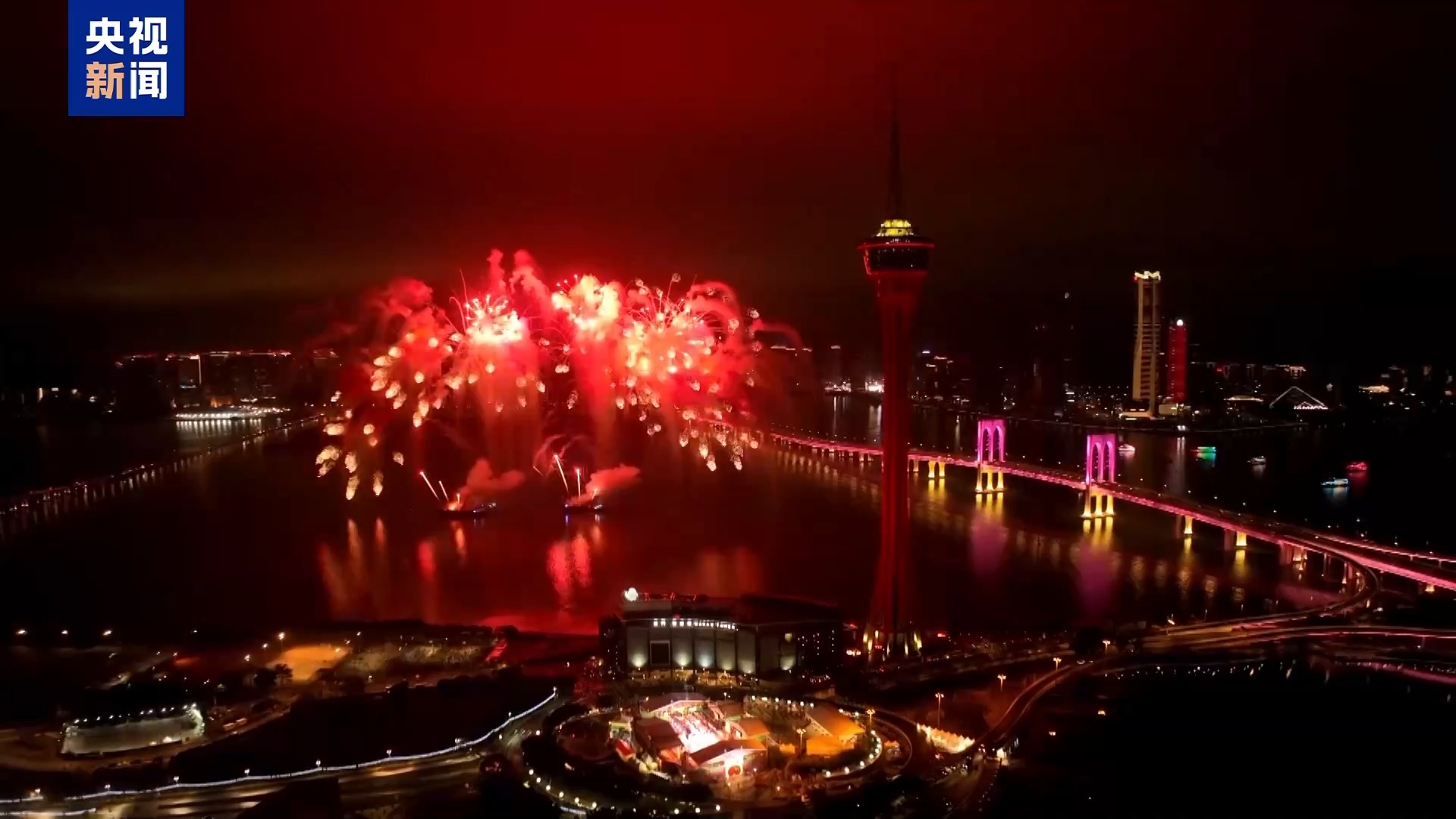 花車匯演后,“歡樂春節(jié) 靈蛇獻(xiàn)瑞煙花匯演”在澳門旅游塔附近海面接續(xù)上演,伴隨著歡快的背景音樂,璀璨奪目的煙花在夜空中輪番綻放。