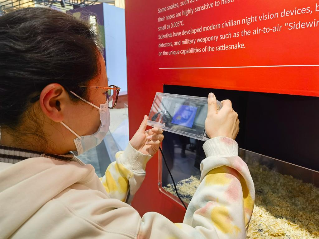 游客在上海自然博物館里通過紅外互動(dòng)裝置了解蛇如何“鎖定”獵物。新華社記者 陳愛平 攝