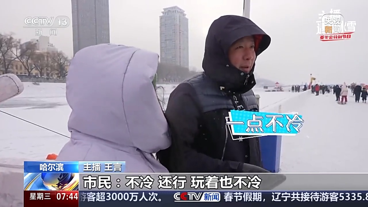主播 王言:天色漸晚,但是我們看松花江上活力不減,今天其實(shí)因?yàn)楹眮?lái)襲還挺冷的,但是我采訪一天聽(tīng)到最多的詞就是不冷,開(kāi)心!哈爾濱有一個(gè)名字叫冰城,在我看來(lái)這個(gè)冰城的冰就是活力的冰,不管你來(lái)自哪兒,只要踏上這里的冰,就能夠感受到滿(mǎn)滿(mǎn)的活力,不管是來(lái)這兒玩冰賞雪的人,還是在這里工作的工作人員,大家都能夠感受到冰天雪地帶來(lái)的勃勃生機(jī)。